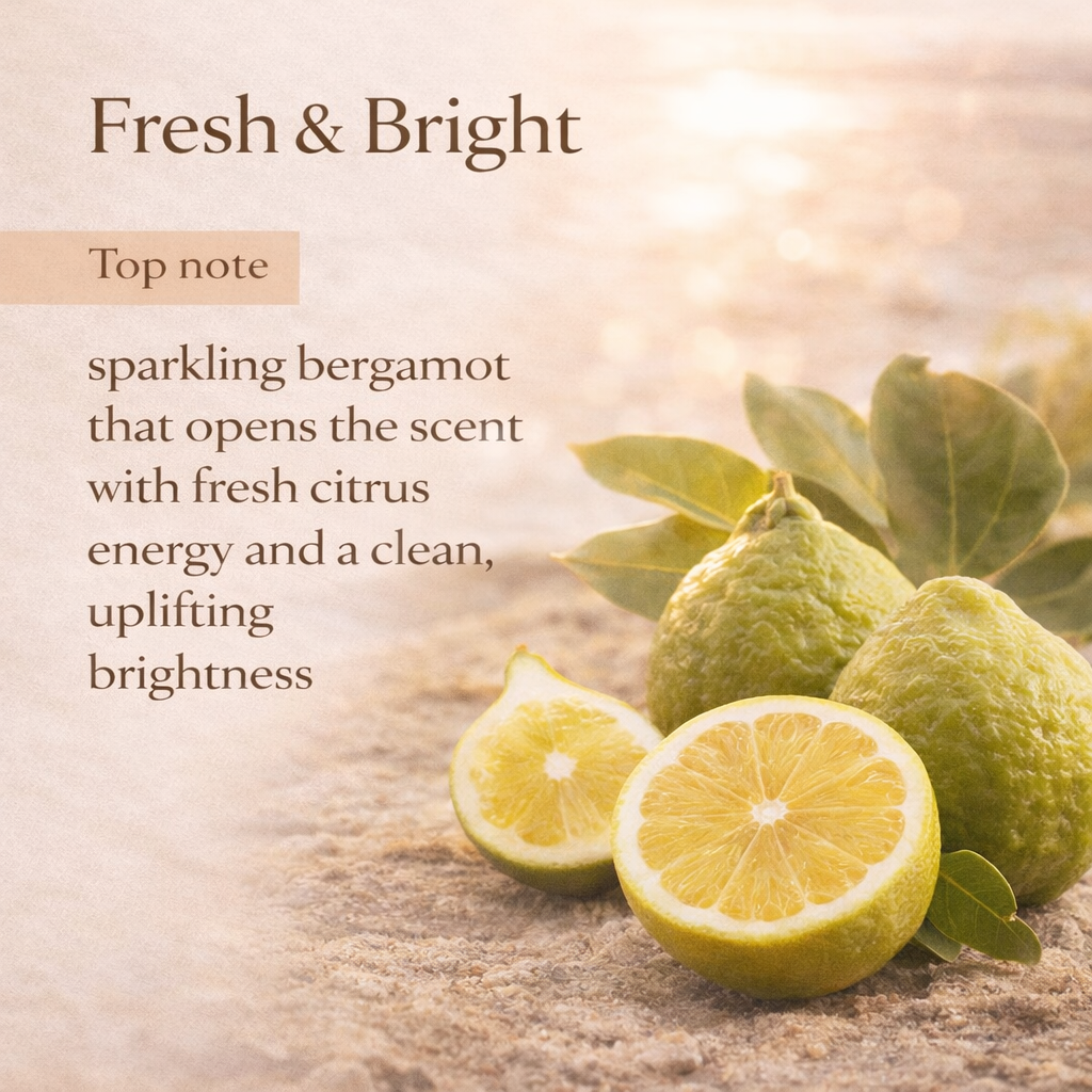A fragrance inspired by Mediterranean light. Sparkling bergamot opens with fresh clarity, followed by green fig leaves that bring a soft natural depth.
